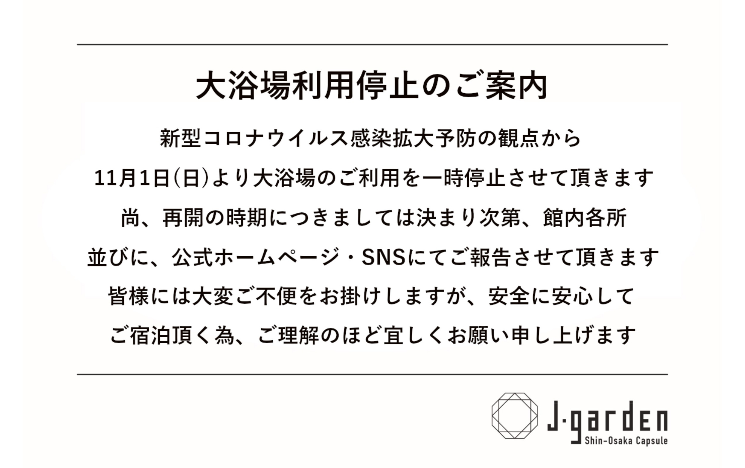 新大阪駅から地下鉄で2分の場所に特別なカプセルホテルJ-garden(ジェイガーデン)が誕生しました。